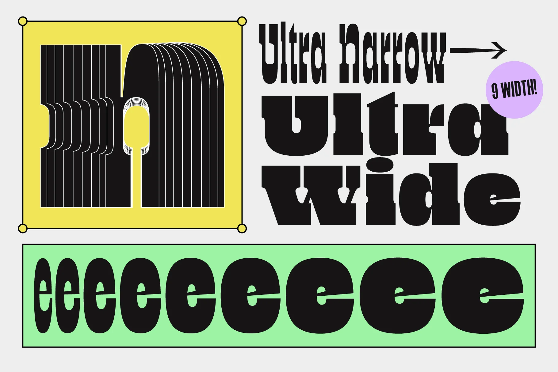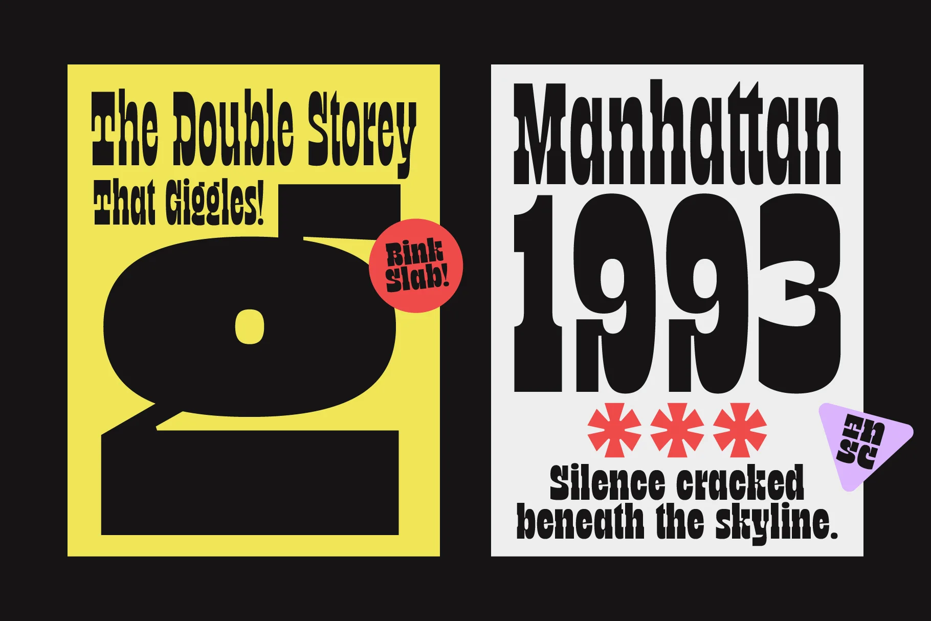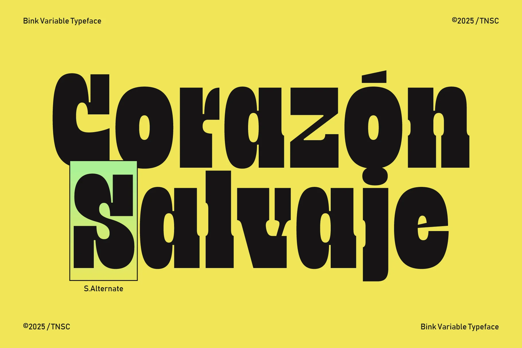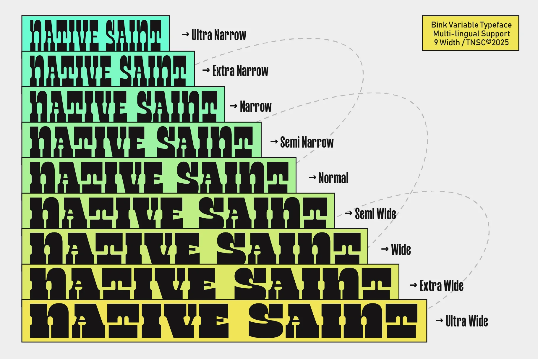 TNSC Bink is a slab serif display font with bold and simple letterforms. The font family includes Ultra Narrow, Extra Narrow, Narrow, Semi Narrow, Normal, Semi Wide, Wide, Extra Wide and Ultra Wide, allowing it to fit different layout needs while keeping a consistent structure. Suitable for titles, posters, branding, and other design work that requires a clear and steady display style.