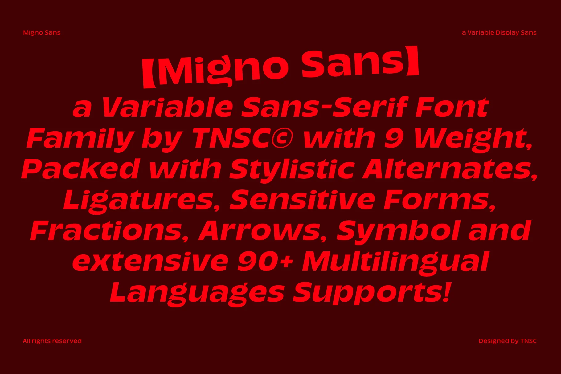 TNSC Migno Sans is a variable and family sans-serif display typeface, offering a full range of weights from Thin to Ultra, including fully designed italics. This typeface is well suited for headlines, posters, branding, and visuals that require a clear and bold typographic presence.